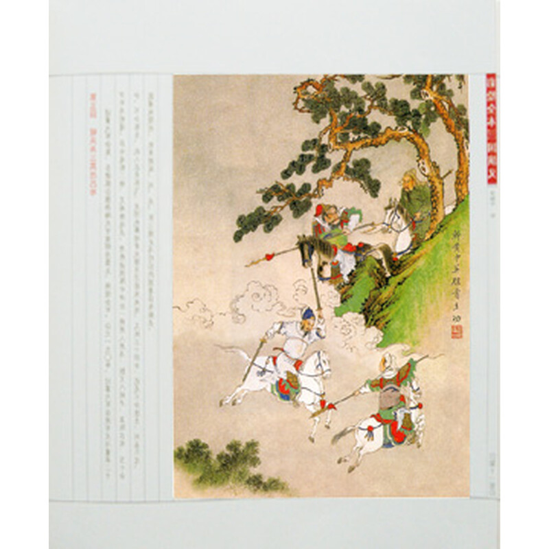 《三国演义》是我国四大古典文学名著之一,数百余年来广为流传,深受广大人民群众的喜爱。自其问世以来,人们尝试以各种不同的艺术形式来演绎。以绘画为例,各种版本的连环画插画本数不胜数。我们今天奉献在读者面前的这部由金协中先生绘制的工笔重彩《三国演义》画册,无疑是一部极具特色的《三国演义》彩绘本,用工笔重彩的技法绘制全本《三国演义》在绘画史上是一个创举。在这部作品中,金协中先生对工笔重彩画的技法做到了充分的发挥。工笔重彩画,重点是线和色的运用,他对线的运用十分精道,以线为主,注意线的园、扁、穿、插、顿、挫和转折,虚实结合,刚柔并用,粗、细相向,浓、淡相宜。以高超、纯熟的技法,灵活运用,支线和周围的环境相互配合,相互渲染,使整个画面达到了高度的统一。赋色则是工笔重彩的重中之重,它关系到作品的成败。金协中所绘《三国演义》,虽是重彩,但重而不浓,各色俱全,恰到好处地运用到整部作品,显示清雅的格调。险峻幽静山水衬托出近景的人物,战马,刀枪,战戟,构图严谨,耐人寻味。许多变化都借用界画技法,把宫室、楼台、殿阁、凉亭、照壁等,都画得规矩有方,工夫所到,妙不可言。整部作品,全部以人物、刀马为主,以山水为辅而构成的,并以工笔重彩的形式绘制而成,每幅画面都十分精彩,如从《刘玄德三顾茅庐》一幅。我们可以看到在大雪纷飞之际,刘、关、张三人骑在马上,人物表情根据每个人的内心活动,表现各不相同,尤其刘备那种求贤若渴的神情,得到充分的体现。整个画面让人感到清新弈人,赏心悦目,同时,又能使人从画面中感悟到某些东西,值得效仿。又如《赵子龙单骑救主》,不仅山水表现得淋漓尽致,而且人物的感情刻画得更加突出:赵云怀抱幼主,只身力拒三将,面部表情十分英武,毫无惧色。各个战将的姿势也尽不相同,但又显得十分协调。举剑、舞刀、弄抢,一招一式又是那么逼真,使得整个场面杀气逼人。而山顶之人看得战战兢兢,整个画面刻画出一场惊心动魄的战斗,色彩也十分浓重。