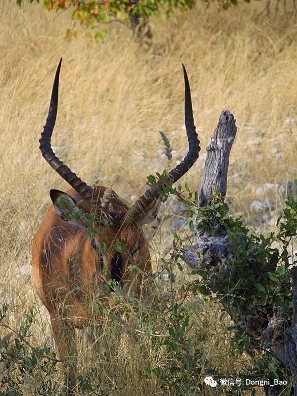 下图的高角羚,俗称黑脸黑斑羚,是牛科高角羚属的动物,跳起来可达三米高,9米远。怕我嫌你黑吗?老躲灌木后面干嘛!