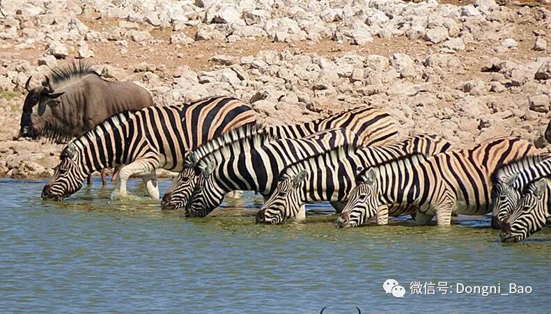 平原斑马们真是热爱集体生活,喝水时都步调一致。岸上的角马,就缺乏纪律性了。