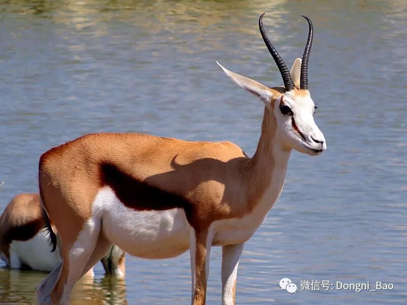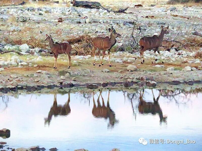 跳羚轻盈可爱,据说它们心情放松的时候才跳跃。跳羚是南非的国兽,它们可以长时间不喝水,是真正的沙漠羚羊。幸运的是,埃托沙的水塘里经常可以看到跳羚,有水喝总比没得喝要强,毕竟这里太干燥了。每天我鼻子都流血,恨不能也趴在水塘里不出来呢!