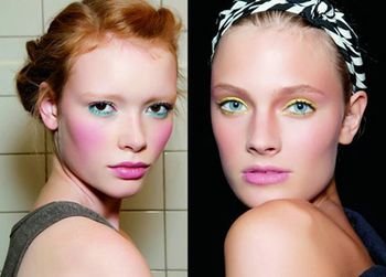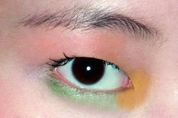 Step1 选择对比度高的亚光色比如桃粉、明黄和翠绿,分上下眼睑对撞涂抹。