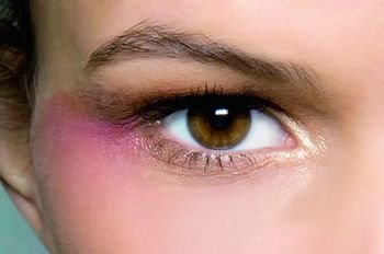 Step2 把淡粉色的珠光腮红淡淡地扫在眼尾至太阳穴的位置,并向颧骨处晕开。