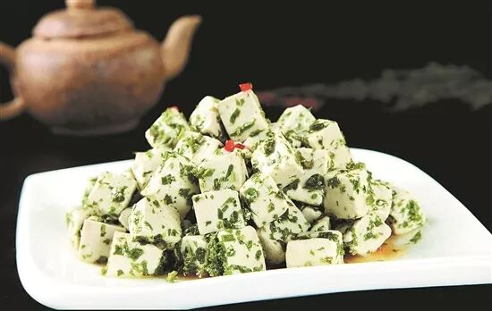 2.用时将腌过的香椿芽切成末,再将蒸透后切小丁的豆腐与香椿芽末放入盘中。