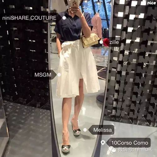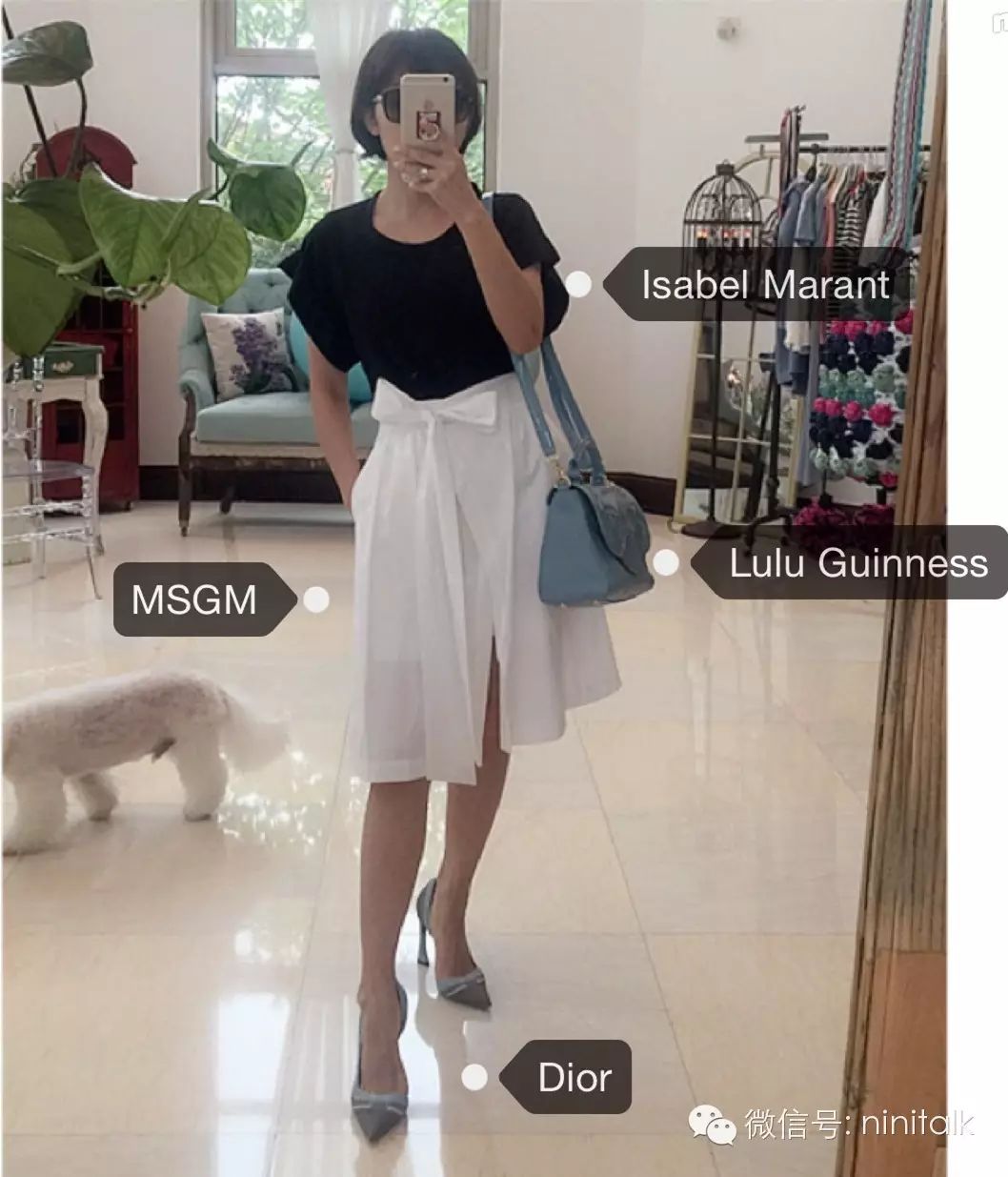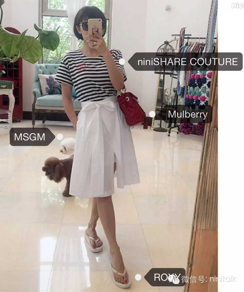 白色裙子在夏天很百搭,最保险的是配黑色上衣。鞋子和包包则什么颜色都可以,但最好是同色系的,或者有些相呼应的色块。