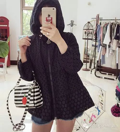 这件外套相当不上相,拍出来很容易就是黑呼呼的一团,但实物是非常嗲的。外层用几种蕾丝拼接,内层是薄薄的防水内胆,抵挡这个季节的小风雨那是没啥问题的。而且它的下摆是娃娃状地撒开,整体轮廓相当可爱。
