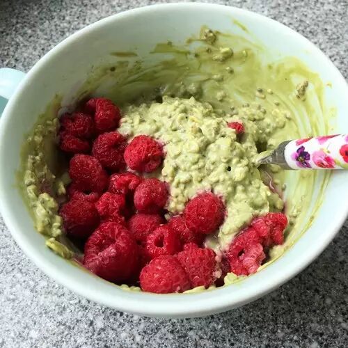 头天晚上我会先把这些东西拌好放在冰箱里,燕麦片和奇雅子吸收了酸奶中的水分会变得软软的很容易入口。