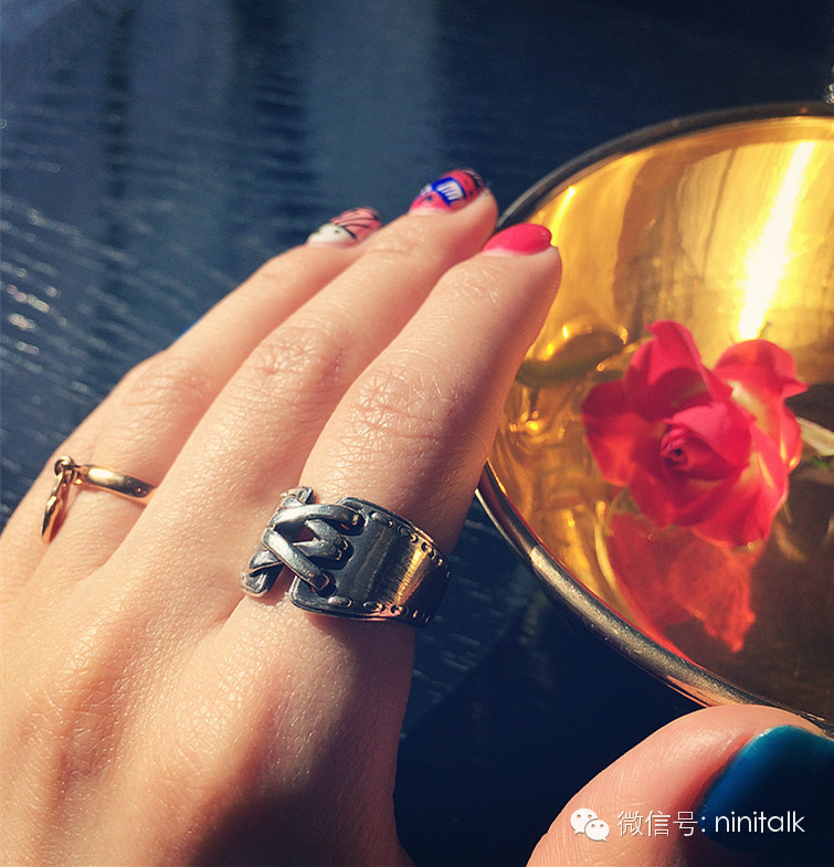 当时这枚尺寸很大,我还是如获至宝地戴在手上。它造型别致又不会过分夸张,本身有着十足的存在感,却能跟任何服装搭配,所以后来我就一直戴着不想取下来了,仿佛成了自己的一部分。