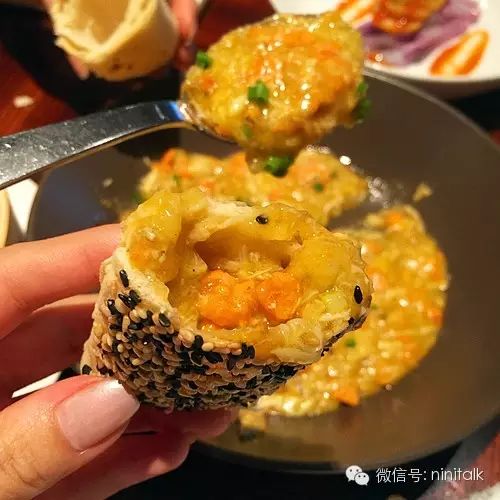 这是在外滩茂悦酒店的“新大陆中国厨房”吃到的蟹粉芝麻酥,属于季节性菜式,过了这段时间就吃不到啦。它是让你把炒好的蟹粉塞进芝麻小烧饼里吃,烧饼做得相当酥脆,边吃会边掉渣那种。