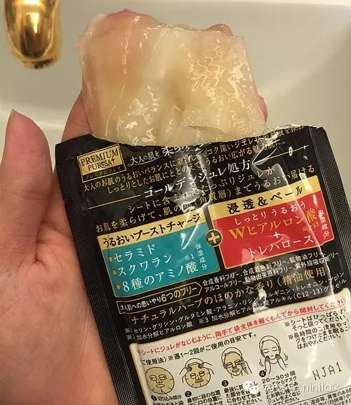 面膜本身质地非常特别,一面是绒的还印着品牌logo,另一面则是软软的果冻状,本身是干的不像普通面膜那样有精华液,因为之前已经把精华液涂在脸上了嘛。不过据说这个果冻胶里面含有蜂王乳成分,能有效防止水分和胶原蛋白的流失。