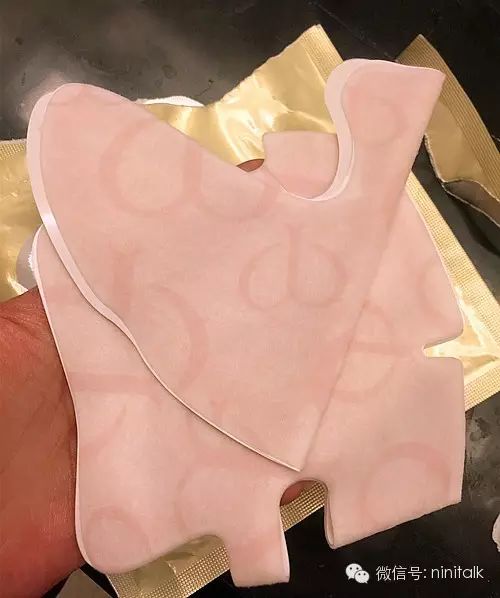 它比较特别的是所谓4D裁剪,双重挂耳能包覆下颚,还有专门一块敷脖子的,要自己绑在后面。这个设计会有种提拉的感觉,但缺点就是会弄到头发上,像我这种喜欢洗澡之后敷面膜的就觉得不太方便,而且耳朵也扯得不舒服。