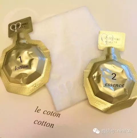 每片面膜配了两颗金色的胶囊,写着1的是带有去角质功效的化妆水,把脸洗干净之后先用它配合化妆棉来把全脸擦一遍,鼻翼下巴等粗糙部位可以重复擦两三次。接下来就把写着2的精华素涂在脸上,稍微按摩一下,它的量足够把脖子也涂到的。