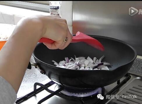 锅烧热后放少许油,下切块的洋葱后转小火翻炒至半透明状。