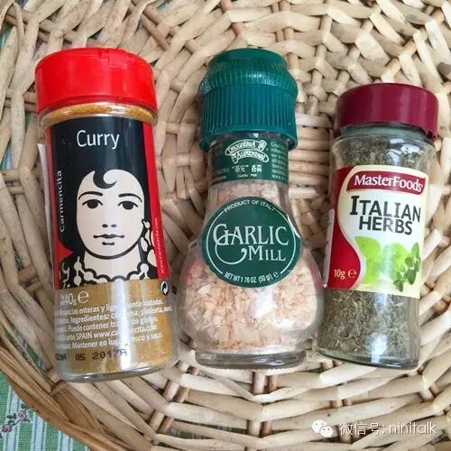 我主要用到的调味品是咖喱粉/香蒜粉和意大利香草,这些东西我自己都是在像Ole和Citysuper这些进口超市买的。淘宝上也能搜到很多,大家不必拘泥于买同样的品牌,具体加什么调料也可以根据自己的口味调整。