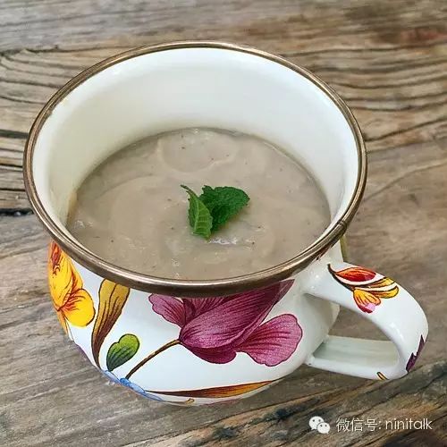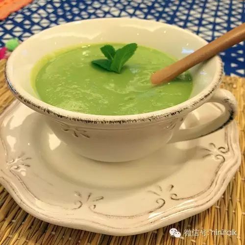 打好装在漂亮的汤杯里并放上薄荷叶做装饰,就是一道卖相口感俱佳的浓汤啊!而且用我的方法来做不需要像普通西式浓汤那样用黄油炒面粉,一样可以达到浓稠creamy的效果,热量大大降低,特别适合减肥期食用。