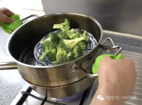 西兰花洗净切小块,水烧开之后上锅蒸8分钟左右,注意不要蒸太久以免变黄。