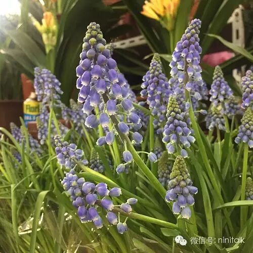 它叫葡萄风信子,就像是普通风信子的mini版,一串串小巧的紫色花朵非常可爱。我第一次看到这种花是在东京吉祥寺的小花店里,日本人好像特别喜欢这种Q版的mini花,把它包成小雪糕筒一样出售,看上去非常精致。回来之后我也只在虹桥花市见到过葡萄风信子,去年也有买过一堆来种在花盆里,蜜蜂特别喜欢它呢😋