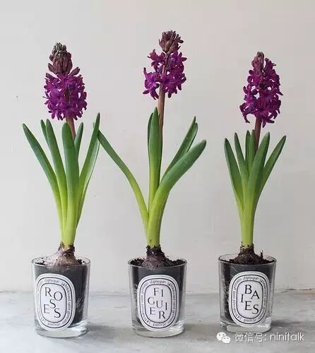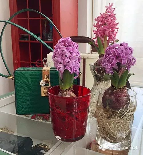 这种是普通的风信子,是我每年冬天都会养的花,可谓养起来毫不费力,但盛开时美丽至极,而且味道很香。通常你买来的时候都是长得像洋葱一样的球根埋在土里,这时候可以换个盆子继续土培,也可以把泥巴洗干净装在玻璃瓶里水培,这种方式是更适合室内的。只要给它一点阳光照射,这颗“洋葱”就会慢慢发芽长出花苞,如果室内暖和的话很快就会开花,带来一室馨香。像左边那种葫芦瓶是专门养风信子的,不过找一个你喜欢的玻璃杯装起来也很有腔调。
