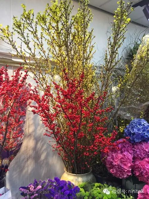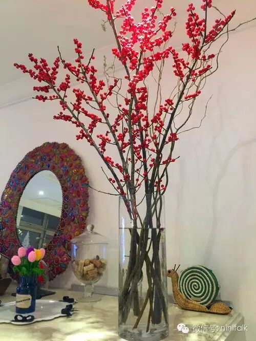 红果果充满了过年的气氛,迎春花则带来了春天的气息,如果家里有大花瓶的插起来会特别热闹。
