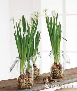 在网上还看到这种用食品密封罐来养水仙的,这种比较深的瓶子还能防止叶子垂下来,真是又好看又实用。