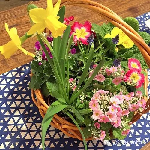 这篮东西买回家往桌上一摆就特别好看,长长的黄色花朵是洋水仙,配合各色报春花,中间紫色那种一串串的小花大家认得吗?