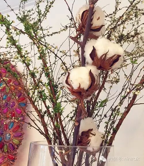这个棉花就真的是用来织布那个棉花哟!它基本属于干花范畴了,不放水也能一直插着不变形,摸上去软绵绵的好可爱。我当初在野兽派花店买得很贵,一支要一百多的样子,后来在虹桥花市看到也就50一支,感觉严重被坑了,从此不在野兽派买花。