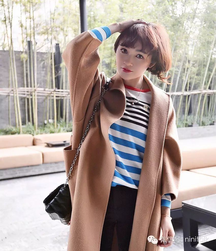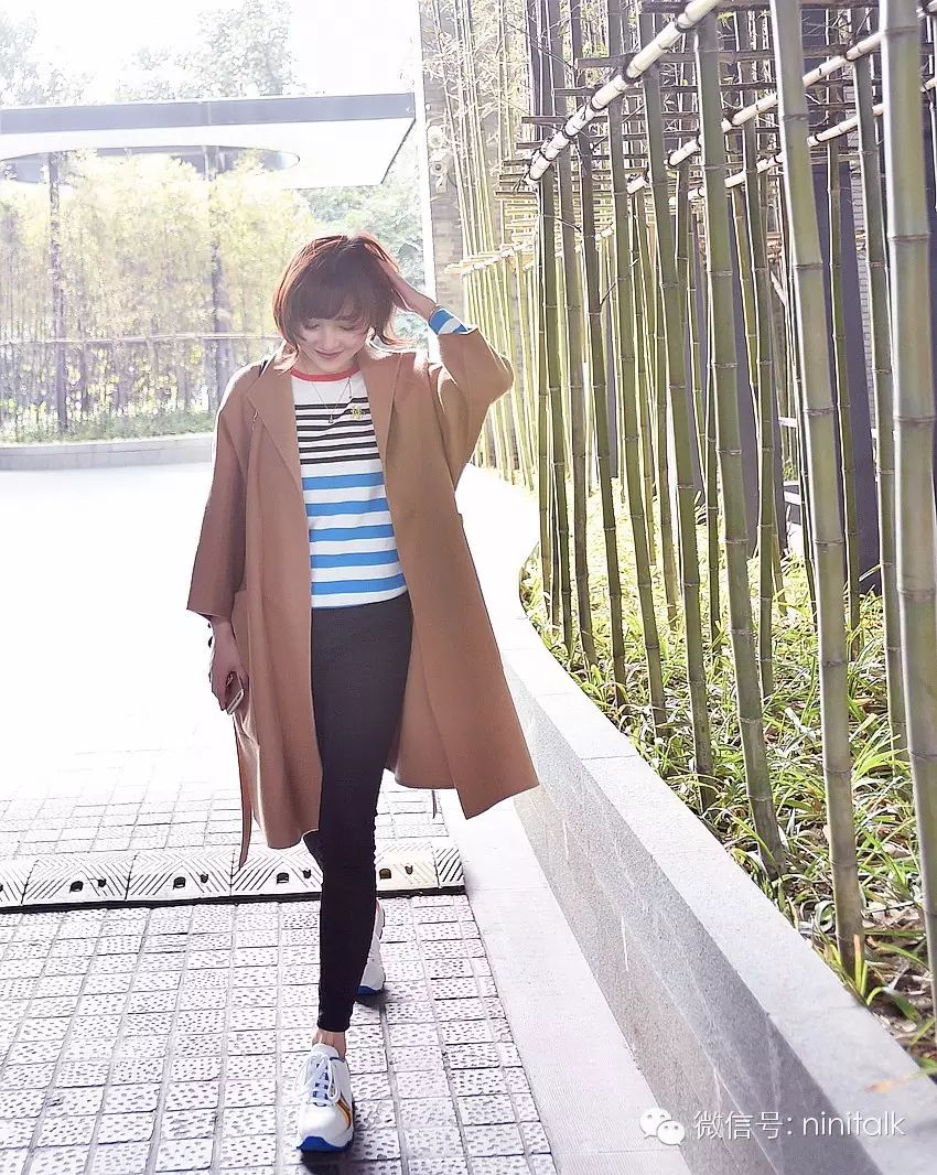 这个效果我看到都啧啧称奇,从正面看条纹完全不会变形,而侧面又能显露出她的姣好身材。这个一方面是是因为针织本身柔软得来有带有骨架,宽窄条纹的组合显得腰身特别好。
