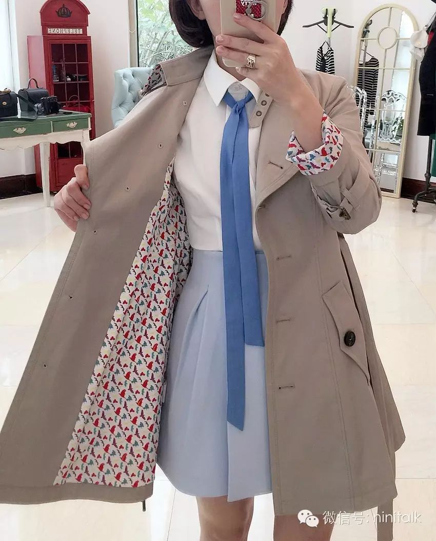 这件风衣大身内衬的面料是纯棉的,略带弹性穿起来很舒服。为了让袖子穿起来平滑,袖笼里面的内衬是聚酯纤维,这些细节都是跟足原版的设计去做的,穿的时候就会感觉到非常人性化。我们只是把内衬图案换成了今年希腊千鸟的主题图案,清新的配色充满春天的感觉,跟这一季很多单品的颜色也是超搭的。