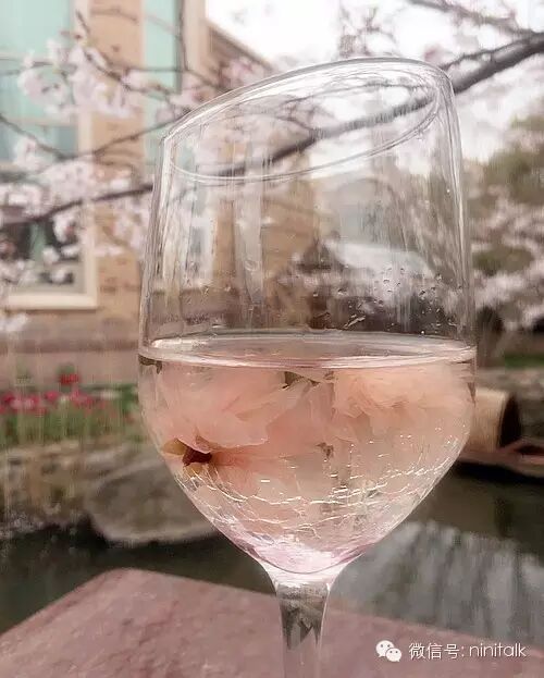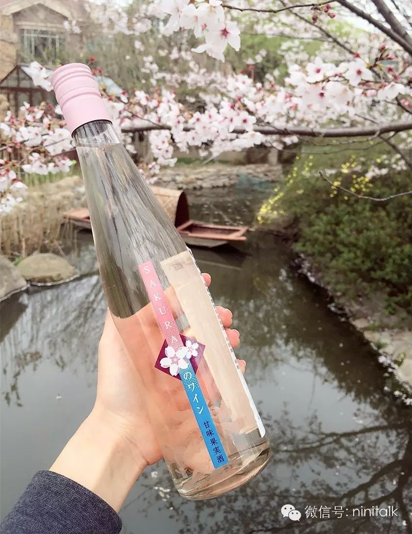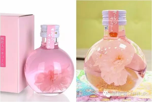 颜值颇高的一瓶酒,两朵重瓣樱花漂在里面,映得里面的酒都有点淡淡的粉色,就算是不会喝酒的铝孩纸也想试试看吧?
