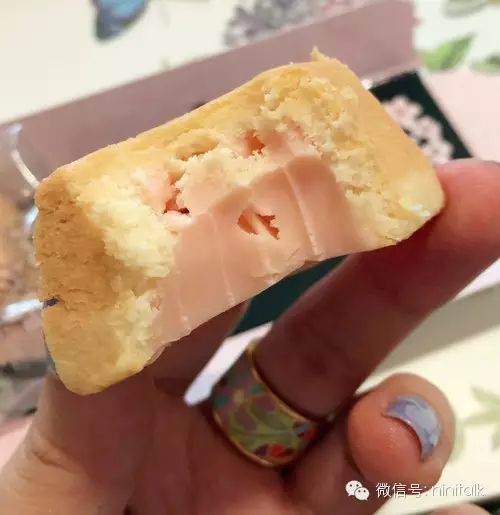 里面粉色的就是樱花芝士夹心,是那种硬奶油的质地,甜中略酸还有微微一抹盐渍樱花的咸味,整体搭配起来味道很雅致。