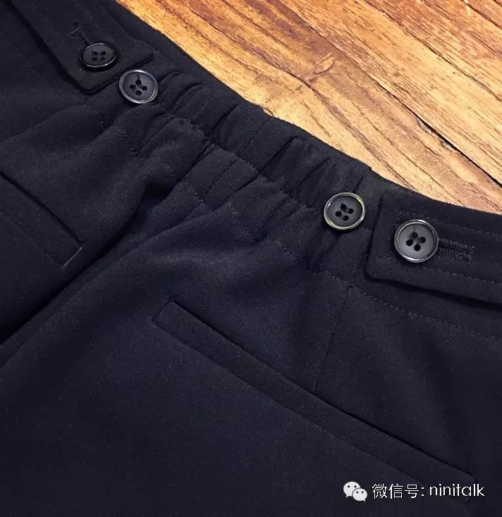 它的背后则加了一小段松紧,还有两颗扣子可以调节腰围大小,所以比完全正式的西裤多了一点休闲的意味,也更加实穿。