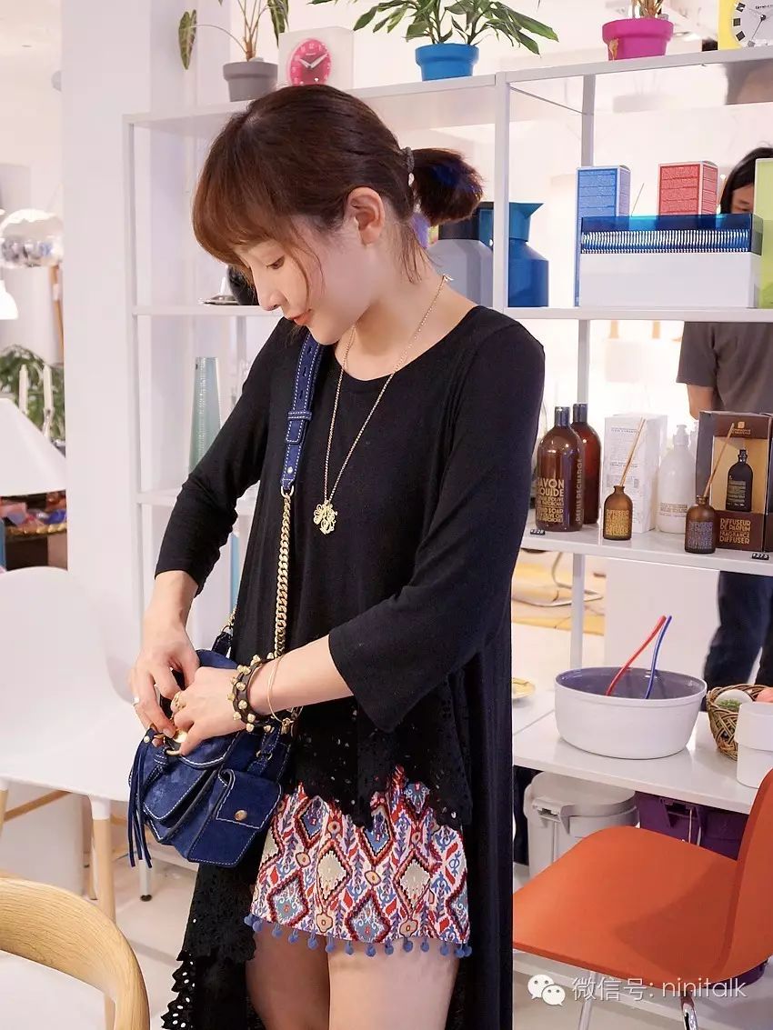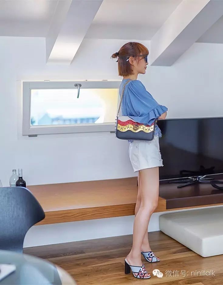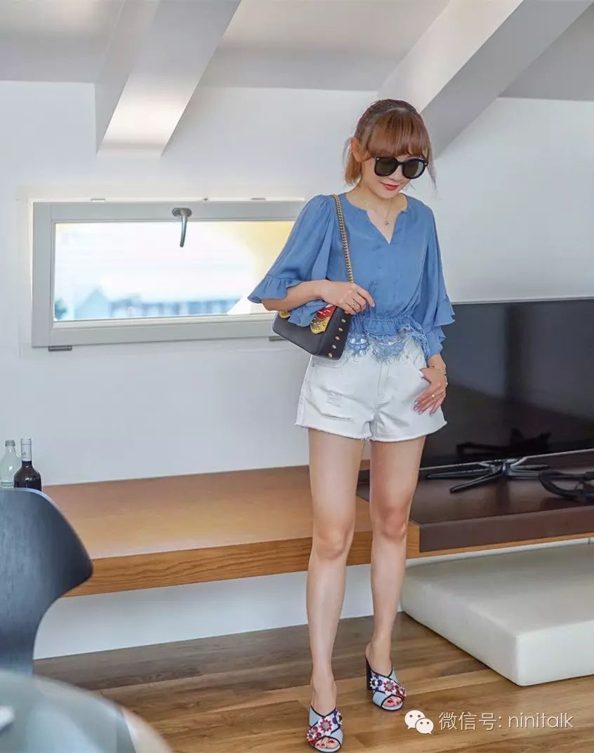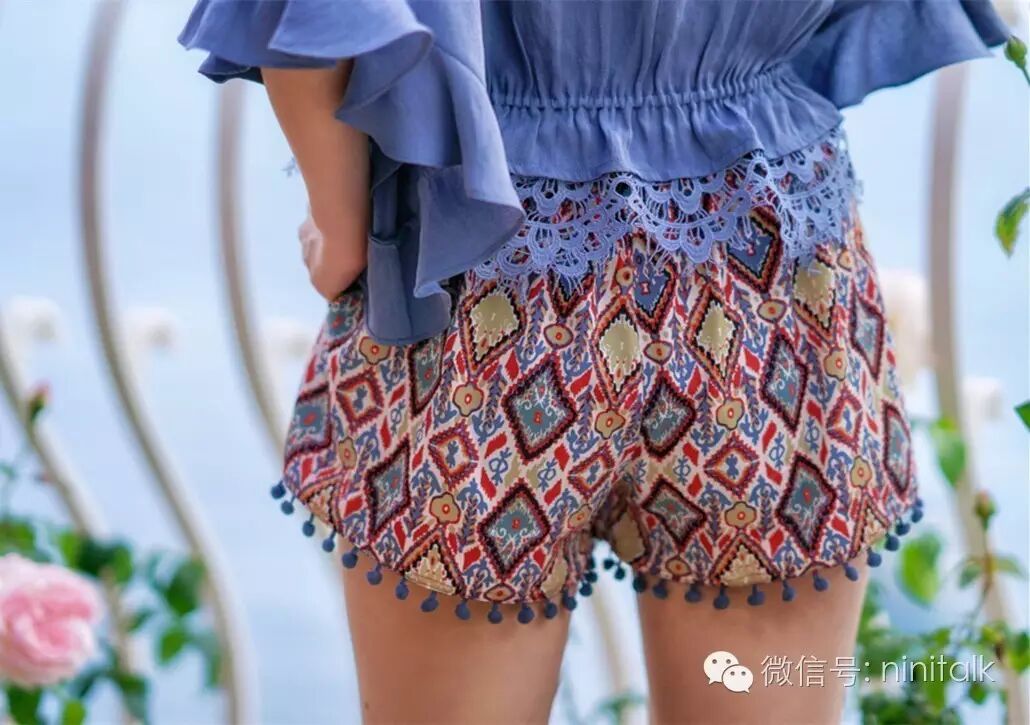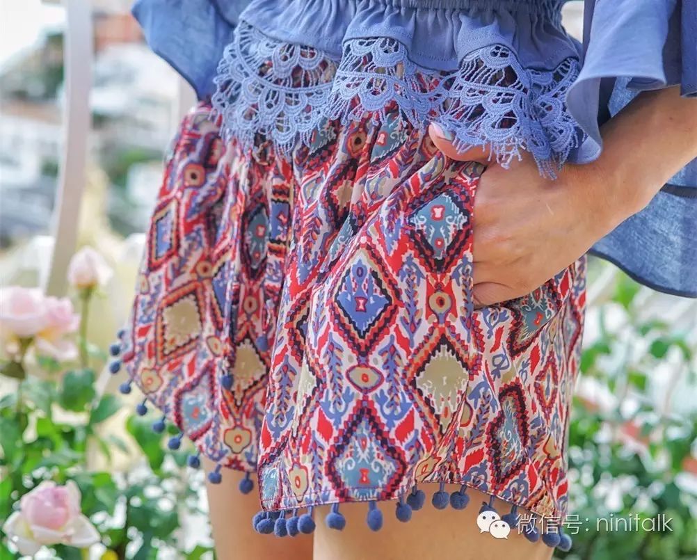 这条短裤跟牛仔蓝上衣是绝配,边上一圈蓝灰色的球球正好呼应起来,又给一条普通的民族风印花短裤增添了不少灵气。