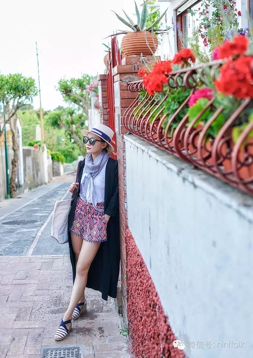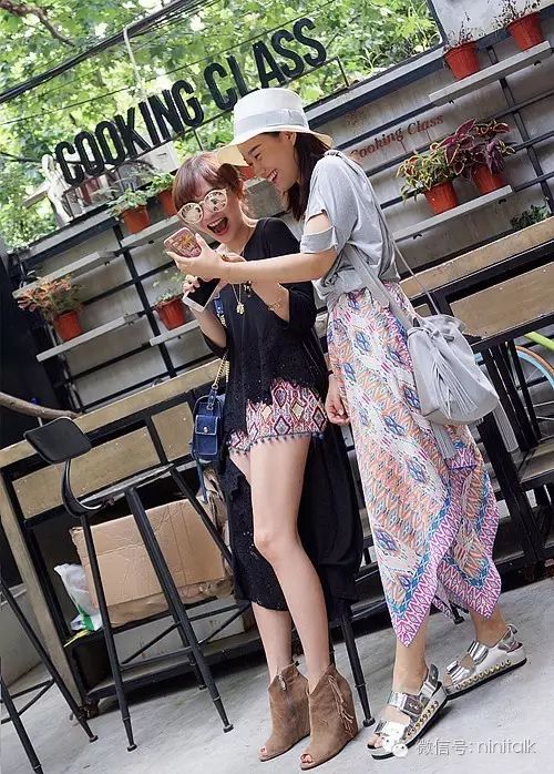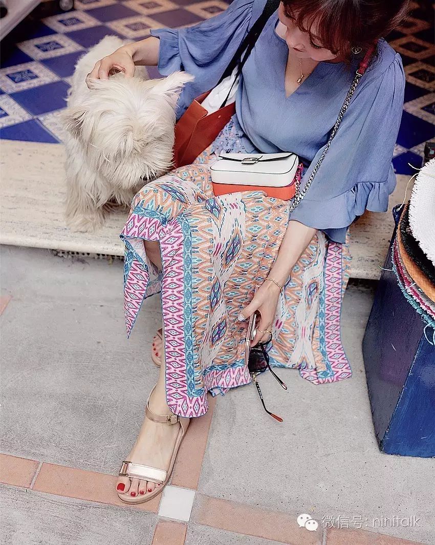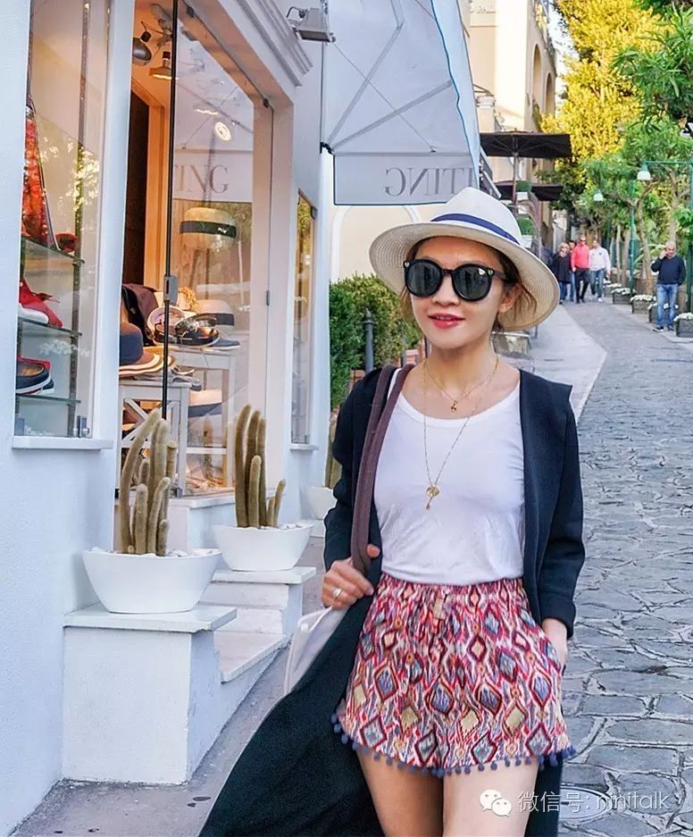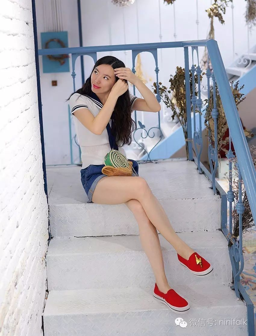 这条短裤跟牛仔蓝上衣是绝配,边上一圈蓝灰色的球球正好呼应起来,又给一条普通的民族风印花短裤增添了不少灵气。