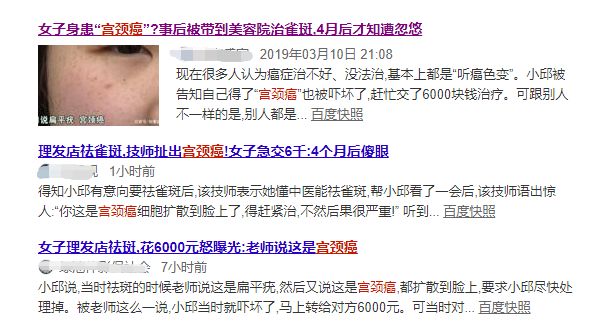 近日,一则《理发店里祛雀斑 “老师”扯到宫颈癌?》的新闻被曝光。报道中称某女士去一家理发店做头发,有位“老师”看她脸上有很多雀斑,说是宫颈癌细胞扩散到脸上了,被吓坏的她赶忙交了6000块钱治疗。但4个月之后,雀斑依然还在,这位女士才缓过神来觉得被骗了。