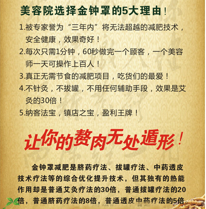 原理:金钟罩减肥是集脐疗、拔罐、温灸、热疗、中药透皮技术等综合优化提升技术刺激穴位,疏通经络、调节脏腑功能、分解脂肪、加速代谢达到减肥的目的。