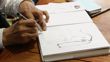 蔡志忠签名时作画,平均一幅只要36秒。和读者的闲聊也没有影响他作画的速度。一笔落下,没有丝毫犹豫。他说,“ 画画的速度不能慢,要不然线条是死的。”