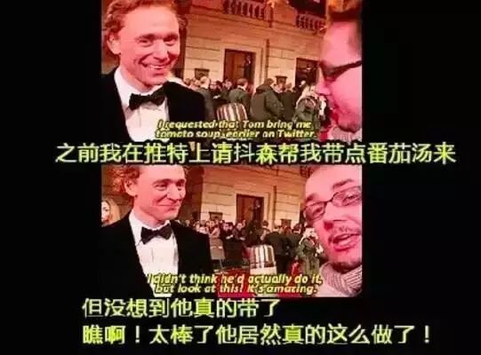 不但是这次对每一个记者合影的要求来者不拒,甚至自己站好等着大家排队合影。之前,有个外国杂志记者公开在社交媒体上喊话抖森,“要是真的绅士,下次采访能否给我带份西红柿汤?”结果,他真的收到了用保温杯装好的汤。