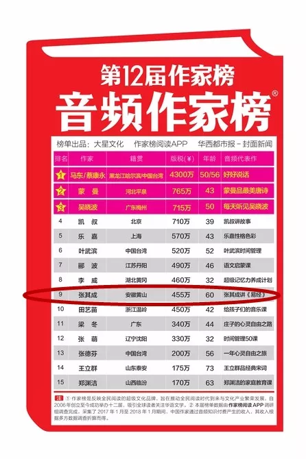 昨(10)日,华西都市报-封面新闻、大星文化、作家榜阅读APP全国独家发布第12届作家榜。作家榜是反映全民阅读的超级文化品牌,自2006年创立自今已成功举办12届。本届作家榜除了主榜之外,还设有明星作家榜、网络作家榜等系列子榜单,全面覆盖文化领域。其中,《张其成讲易经》喜马拉雅节目荣登首发的作家榜全新品牌的子榜单“音频作家榜”第九名!!