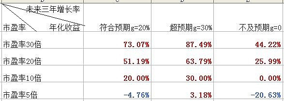 4.引用推论:“当PE2,股票年化收益率小于每股收益增长率”,可知,当三年后市盈率小于10倍时,该股的年化收益率为负值。