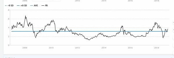 答:由于当时中兴通讯每股收益为负,故PE也为负值,无很好的参考价值。所以参考市净率历史图表,如下