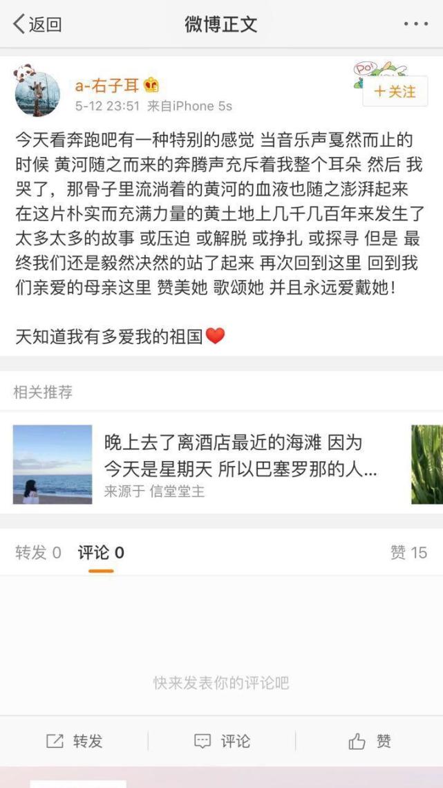 在节目播出结束以后,社交媒体上网友对于这段黄河大合唱的如潮好评亦如同奔腾的黄河延绵不绝。网友“a-右子耳”的微博代表了绝大多数观众的心声“今天看《奔跑吧》有一种特别的感觉,音乐声戛然而止的时候,黄河随之而来的奔腾声充斥着我整个耳朵。然后我哭了,那骨子里流淌着的黄河的血液也随之澎湃起来。在这片朴实而充满力量的黄土地上几千几百年来发生了太多太多的故事,或压迫、或解脱、或挣扎、或探寻。但是,最终我们还是毅然决然的站了起来,再次回到这里,回到我们亲爱的母亲这里。赞美她!歌颂她 并且永远爱戴她!天知道我有多爱我的祖国!”字字质朴,却句句振聋发聩!