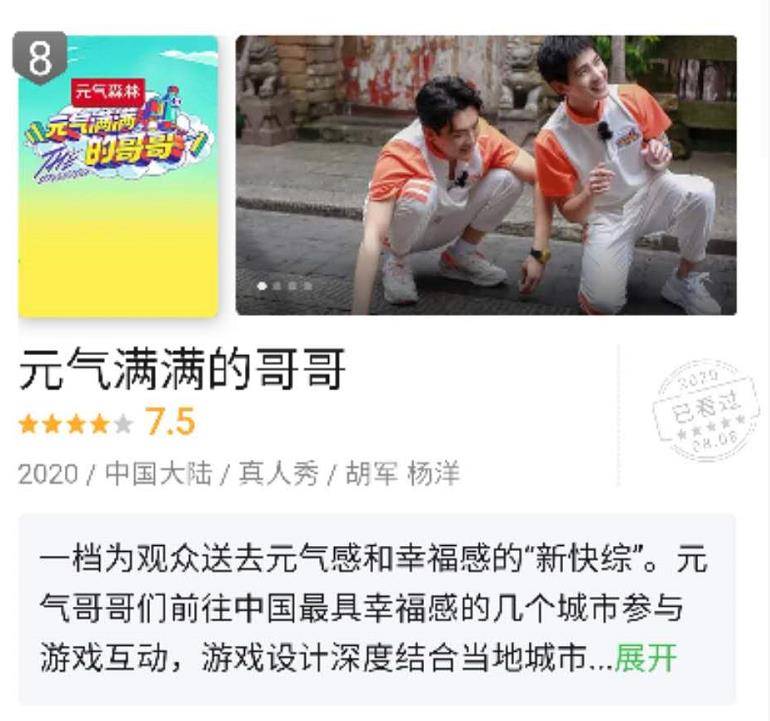 应该没有多少人还没看到《元气满满的哥哥》,这档定位于代际互动观察类游戏综艺,给我们贡献了太多满满的欢乐。个人以为,这是继原班人马《极限挑战》之后最好看的纯男综艺。最近豆瓣出台的国内口碑综艺榜单,排名前十位的仅有《元气满满的哥哥》一档台综。