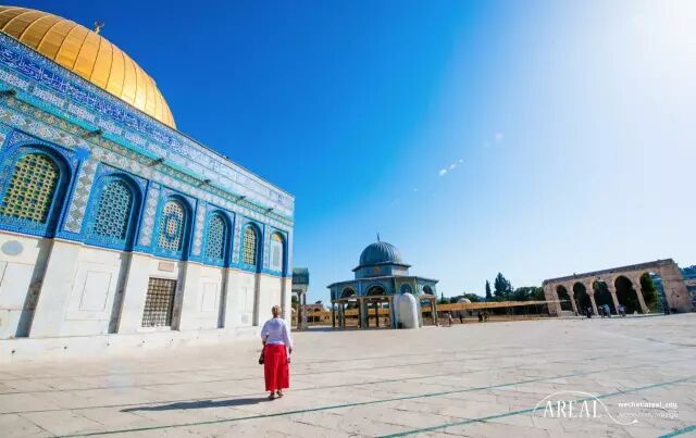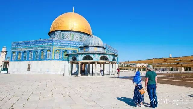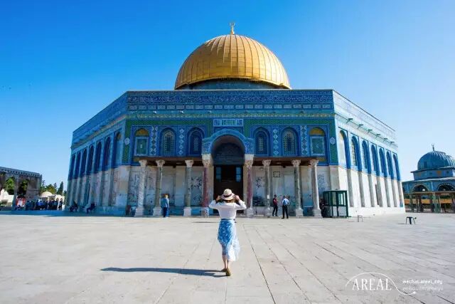其实它并非清真寺,只是人们习惯性的叫法。它而是一处圣地,因内部供奉的“基石”而变得神圣无比。蓝绿色花纹陪衬着闪着金色光芒的圆顶,无论从任何地点鸟瞰耶路撒冷,能看一眼望见熠熠生辉的圆顶清真寺。