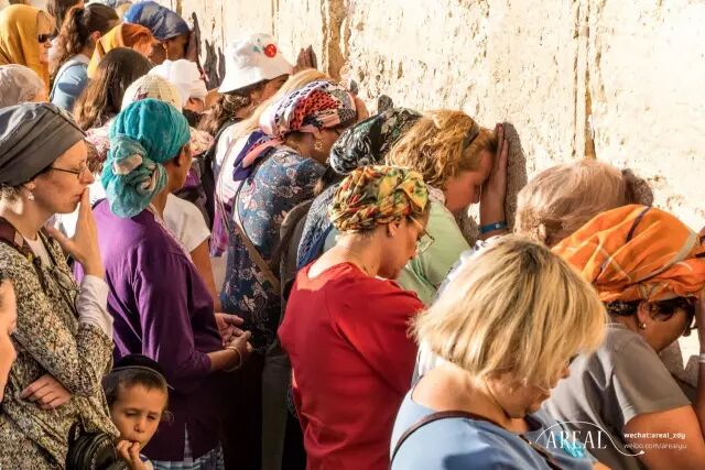 哭墙祷告分为男女两个区域,男士进入前需头戴小帽。面对哭墙也就是麦加的方向祈祷完成后,再一直面朝此方向倒退出去以示虔诚。