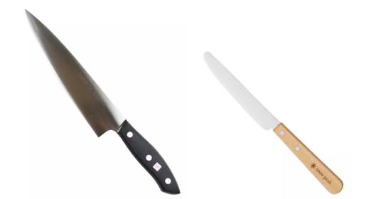 左边是德国刀,右边是日本刀。二者做工皆精良,刀刃皆锋利。不同之处在于刀柄和刀尖,德式为塑胶刀柄尖式刀尖,日式为木头刀柄圆头刀尖。日本刀想要的是:不仅要给使用者最棒的握感,而且要让使用者在握住刀柄的一瞬间,不会感到冰凉,并且在刀子不慎坠落的一瞬间,不至于将使用者的脚刺伤。德国人可能就不会太细致考虑这样的“人文关怀了”。将刀做到最锋利,用最好的钢材,性能卓著的这便是好刀。