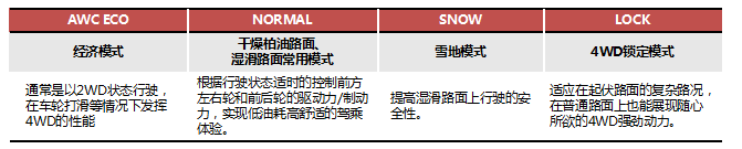 它根据路况切换控制模式,可以获得最适合的控制效果。不管是在普通路面,还是湿滑雪地里,都能适当控制左右前轮和前后轮的驱动力/制动力,实现最大限度提高车辆高速稳定性、通过性和脱困性,做到各种路况,都能从容面对。