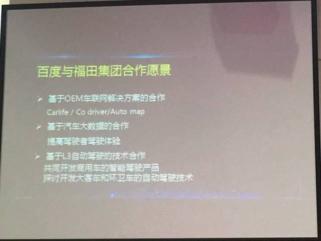 福田汽车将协助百度开发包括Carlife和车机两个版本的商用车导航及测试和高精度地图,利用百度的高精度地图、语音等技术为用户提供导航、查询车况、电话等智能行车服务。