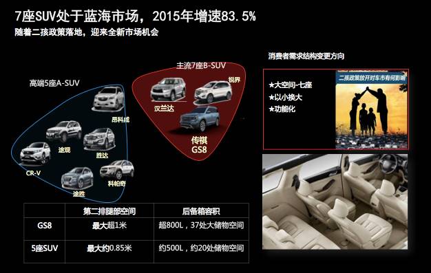 因此,从产品定位和价格定位来看,瞄准7座SUV市场的传祺GS8“上攻下压”优势明显。但是,传祺GS8展现出的“爆款”魅力,并不局限于此。