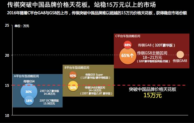肖勇还用一组数据告诉我们,2016年,传祺品牌销量重心突破14万元。随着C平台GA8与GS8的上市,传祺品牌将突破中国品牌难以超越的15万元价格天花板,并从此站稳脚跟;