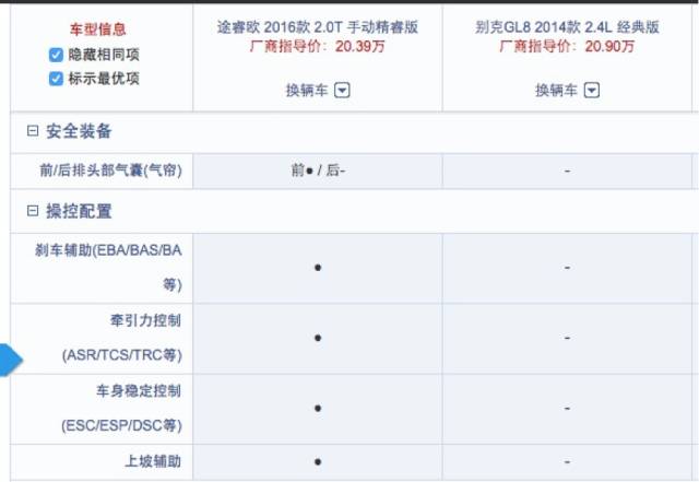 从上图很明显能看到,GL8明显是输了,没有头部气帘,侧面撞击或者是翻车那头可救只能硬生生的撞玻璃,并且没有刹车辅助上坡辅助牵引力控制我都忍了,为什么连ESP都没有!ESP的作用我不再赘述。