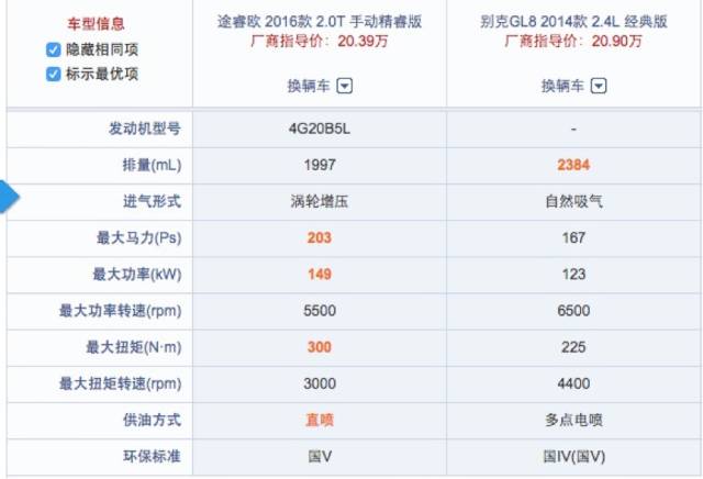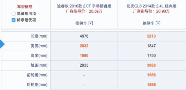 而途睿欧上市仅有两款车型,售价为17.69万-20.39万,两款车的差额可以从配置表上看出一分价格一分货,诚意盖过GL8;并且,其低配的配置起点也高。而今天我们将对比的两款车型分别是售价为20.39万的2016款 2.0T 手动精睿版,以及售价为20.9万的别克GL8 2014款2.4L 经典版,让大家一探谁更能扛大旗。